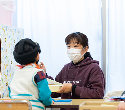 初めての事や場所が苦手。騒がしい等の音に対して過敏な所がある。手先の不器用を感じる等の発達に心配があるお子さんが保護者と離れて、日常生活の支援や設定の活動を通してやってみる、出来た、楽しかったなどの体験を積んでいく場所です。また、保護者と相談をして身辺面やコミュニケーションなどの目標を立て取り組んでいます。